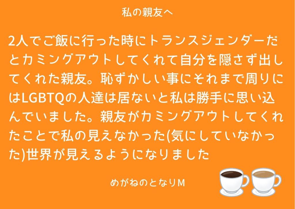 | めがねのとなりM | 大阪府 | パートナーへ 私のパートナーはトランスジェンダーです。 彼と付き合うまではいわゆるシスジェンダーの男性とお付き合いしていました。初めて出会った時から惹かれていてお付き合いしましたがトランスジェンダーと言うだけで色々とハードルが上がるのです。 親への紹介、家を借りることや、旅行先などいろいろ。 結婚もしたくても体に負担となる手術をしなければ私たちは結婚できません。 周りにも堂々と結婚しましたと言えていないのが現実です、これがシスジェンダーの男女であれば…こんな所でつまずかないのになぁと思ってしまうことも、周りが羨ましくなることも正直ありますがパートナーはどんな時もちゃんと向き合ってくれて一つ一つ解決できるよう一緒に考えてくれます。 これからもパートナーと今まで通りちゃんと話し合って一つ一つ一緒に乗り越えていけたらと思っています。 いつも支えてくれてありがとう。 あなたは最高のパートナーです。 私の親友へ 初めて出会ったのは2年前、出会った瞬間はこんなにも身近な存在になるとは思ってなかったね。2人でご飯に行った時にトランスジェンダーだとカミングアウトしてくれて自分を隠さず出してくれた親友。 恥ずかしい事にそれまで周りにはLGBTQの人達は居ないと私は勝手に思い込んでいました。親友がカミングアウトしてくれたことで私の見えなかった(気にしていなかった)世界が見えるようになりました。 おかげで今では職場でもLGBTフレンドリーを広げることができ、アライとしてみんなの「なりたい自分になる」をお手伝いしています。 親友には感謝とあんまり無理しないでねでもしっかり応援していることを伝えたいです。出会ってくれてありがとう。 |
