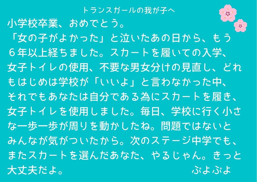 | ぷよぷよ | 東京 | トランスガールの我が子へ 小学校卒業、おめでとう。「女の子がよかった」と泣いたあの日から、もう6年以上経ちました。スカートを履いての入学、女子トイレの使用、不要な男女分けの見直し、どれもはじめは学校が「いいよ」と言わなかった中、それでもあなたは、自分である為に、スカートを履き、女子トイレを使用しました。毎日、学校に行く小さな一歩一歩が、周りを動かしたね。問題ではないとみんなが気がついたから。次のステージ中学でも、またスカートを選んだあなた、やるじゃん。きっと大丈夫だよ。 |